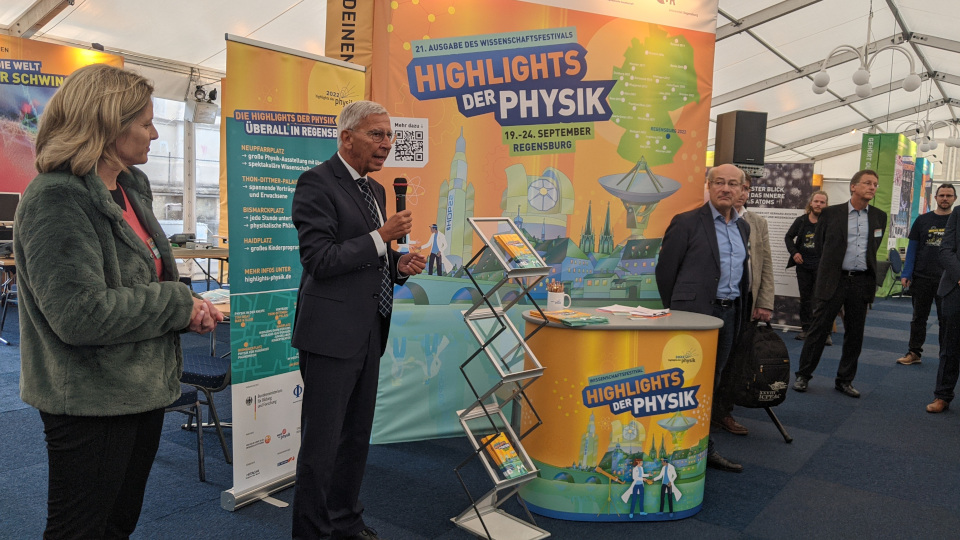 Auf dem Neupfarrplatz mitten in der Regensburger Altstadt steht für eine Woche unübersehbar ein großes weißes Zelt, in dem alle Interessierten aktuelle Forschung und Physik hautnah erleben können. Jedermann kann hier aus erster Hand Informationen über Wissenschaft und im direkten Austausch mit Wissenschaftlern vieles über ihre Forschung erfahren. Prof. Dr. Ullrich, quasi Gastgeber der Veranstaltung, benennt die „Highlights der Physik“ nicht zu Unrecht als eine der erfolgreichsten Wissenschaftsshows der letzten 20 Jahre. Nachdem vor Kurzem erst Europas größte Physiktagung ihren Weg an die Regensburger Universität gefunden hatte, freuten sich die beiden Professoren zusammen mit Bürgermeisterin Dr. Astrid Freudenstein, dass nun auch die breite Bevölkerung in den Genuss der physikalischen Forschungen diverser Universitäten und Lehrstühle kommen kann.