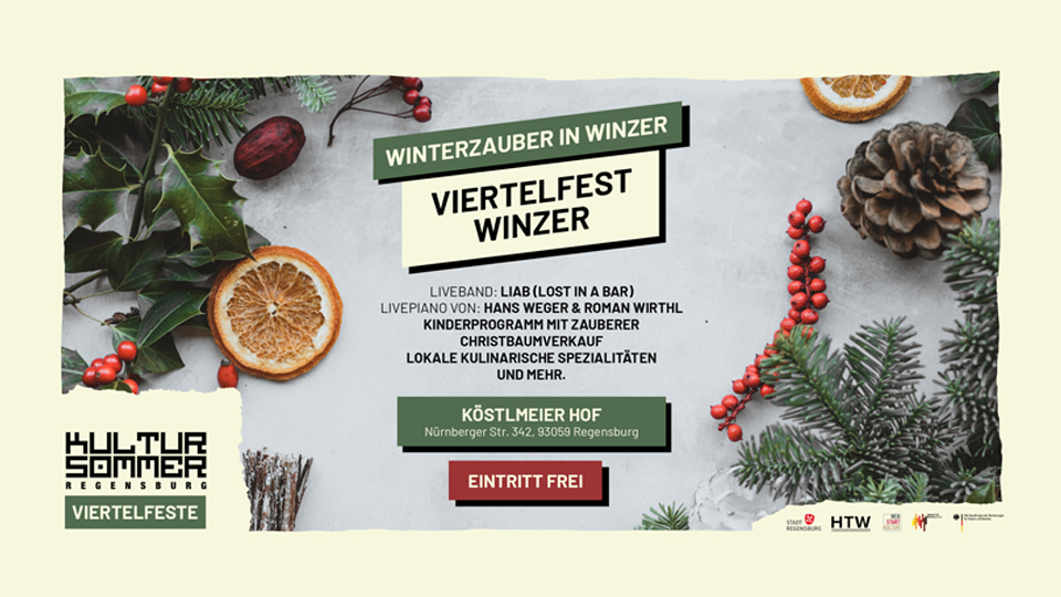 Das ursprünglich für den 2. Oktober geplante Viertelfest musste wetterbedingt verschoben werden. Nun wird das Fest als „Winterzauber in Winzer“ am ersten Adventssonntag nachgeholt. Der Kultursommer Regensburg 2022 bekommt so eine kleine Weihnachtsedition. Am Sonntag, dem 27. November, präsentiert der Kultursommer Regensburg 2022 von 13.00 bis 20.00 Uhr unter dem Motto „Ökologie und Nachhaltigkeit“ das Viertelfest Winzer.