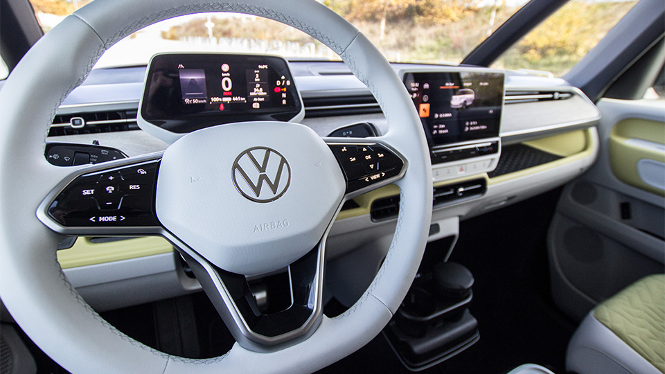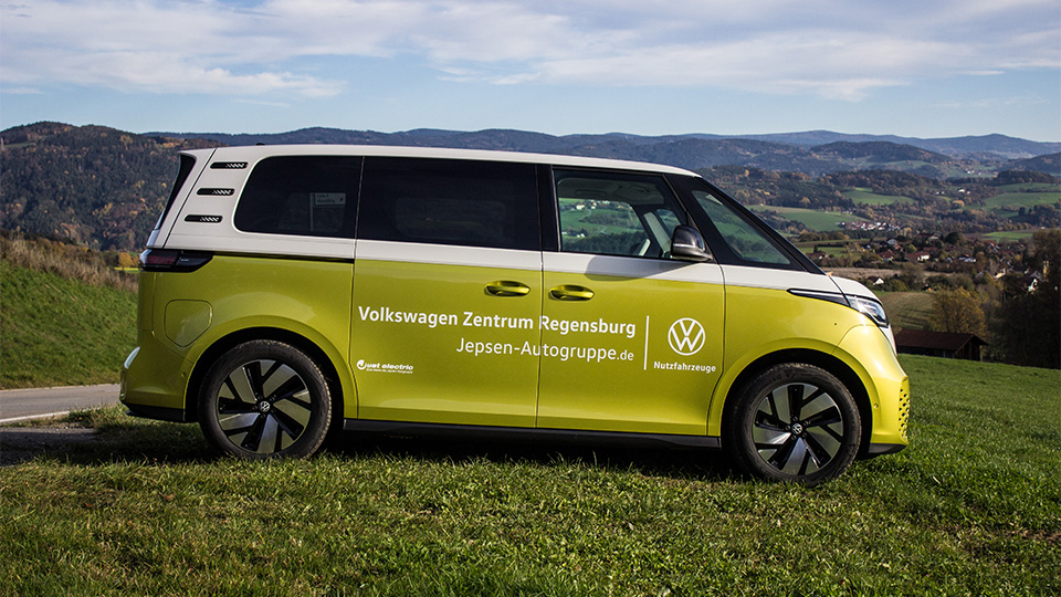 In aller Ruhe gleiten wir die Donau entlang und über Wiesenfelden in Richtung Viechtach. Die Sprachsteuerung ist inzwischen wirklich fit und erkennt sofort jedes gesprochene Dorf. „Feyda“ (im Dialekt für Viechtach) wäre sicher zu viel verlangt, aber in der letzten Generation war „Navigation Kelheim“ auch dialektfrei einfach nicht möglich. Vorbei. Auch die Tasten am Lenkrad wurden von Berührungssensoren mit Wischfunktion wieder auf Drucktaster umgestellt – beim Lenken gibt es nun keine ungewollte Änderung der Distancecontrol oder der Lautstärke mehr. Die Software sitzt und es greift alles perfekt ineinander. Segeln Sie gerade ohne Gas rollend auf eine Ortschaft zu, so bremst der ID.Buzz rekuperierend sanft vor dem Ortsschild auf 50 km/h runter, so hält er auch in Gefällen die erlaubte Geschwindigkeit oder verzögert damit vor engen Kurven. Wie gesagt – nur unterstützend und soweit Sie keines der Pedale benutzen. Es fährt sich äußerst bequem damit, ohne dem Fahrer etwas aufzuzwingen. Ein gelungenes Konzept!