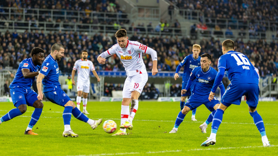Direkt zu Beginn der Partie übernahmen die Gastgeber die Rolle der spielbestimmenden Mannschaft. Nach zwei gespielten Minuten die erste große Chance für den KSC: Schleusener bekam nach einem Zuspiel aus zentraler Position den Ball auf die rechte Seite gespielt und stellte Jahn Schlussmann Urbig direkt auf die Probe. Dieser reagierte überragend und auch der Nachschuss fand nicht den Weg ins Tor. Die erste Torannäherung des SSV dann über Gimber, der nach einer Ecke an den Ball kam, aber dessen Versuch keine weitere Gefahr für den Gastgeber stellte (10.). Im direkten Gegenzug verfehlte dann Nebel aus zentraler Position das Tor der Jahnelf nur knapp links (11.). Der Kapitän Benedikt Gimber zieht weiter positives aus dem Auftreten seiner Mannschaft: „Wir geben uns nicht auf und müssen weiterarbeiten, damit das Glück auch wieder auf unsere Seite fällt. Wir haben uns in der Vergangenheit schwergetan, wenn wir hinten lagen. Heute hatte ich auf dem Platz das Gefühl, dass wir jederzeit gefährlich waren, uns nicht aufgegeben haben und hätten zurückkommen können.“