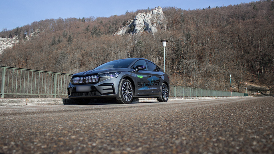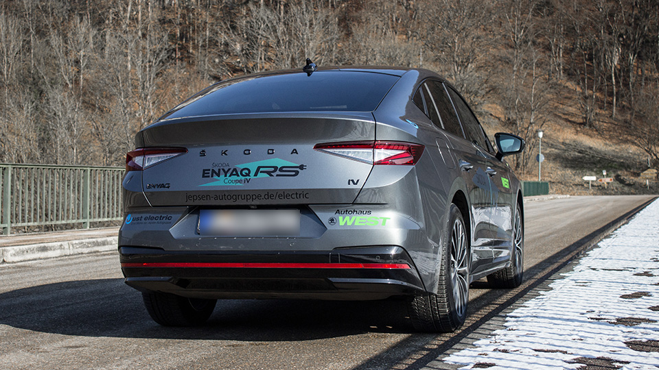 Es ist Mitte Februar, stahlblauer Himmel bei Graden um den Gefrierpunkt und darunter, als wir unser Testfahrzeug – den Enyaq Coupe RS – im Neutraublinger SKODA-Autohaus der Jepsen Autogruppe frisch geladen abholen. Kantig, frech und trotzdem mit einer angenehm fließend gezeichneten Silhouette präsentiert sich der Ende 2022 auf den Markt gekommene RS. Einher geht damit ein der Reichweite zuträglicher cw-Wert von 0,234. Mit 4,65 Meter Länge, 1,88 Meter Breite (ohne Spiegel) und 1,61 Meter Höhe ist das Fahrzeug perfekt für den urbanen Einsatz ausgelegt – wirkt optisch jedoch durchaus noch massiver.