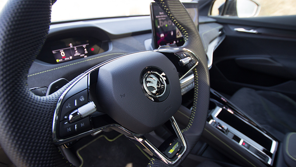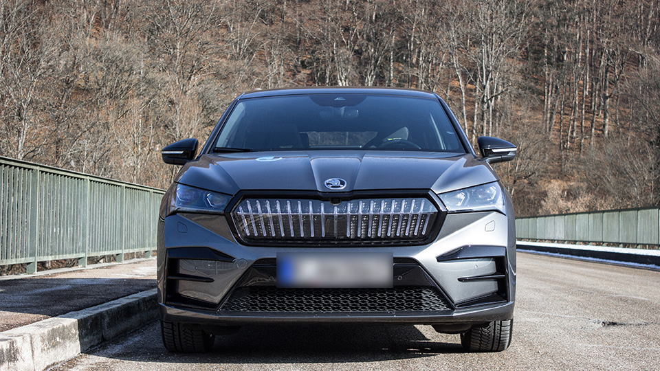 Und natürlich bekommt das markante Äußere auch kräftige innere Werte aus dem VW-Konzern: Zwei Elektromotoren erzeugen besagte 220 kW. Mit voller Batterie und mittleren Temperaturen sind damit laut Skoda bis zu 517 Kilometer Reichweite möglich. Dafür steht ein Akku mit einer nutzbaren Kapazität von 77 kWh zur Verfügung. Auf der Landstraße haben wir bei durchschnittlich 80 km/h 16,5 kW/h verbraucht, womit man circa 470 Kilometer weit käme. Fährt man langsamer (etwa in der Stadt), kommt man weiter, bei 100 km/h wären es um die 400 Kilometer. Dabei ist aber zu berücksichtigen, dass es wirklich kalt draußen war. Es bedarf dann sowohl der Heizung für den Fahrgast als auch der Heizung für den Akku selbst! Untersuchungen zeigen, dass dadurch im Winter 10 bis 30 Prozent mehr verbraucht wird als im Sommer, unsere eigenen Erfahrungen bestätigen das.