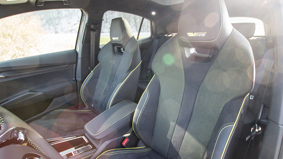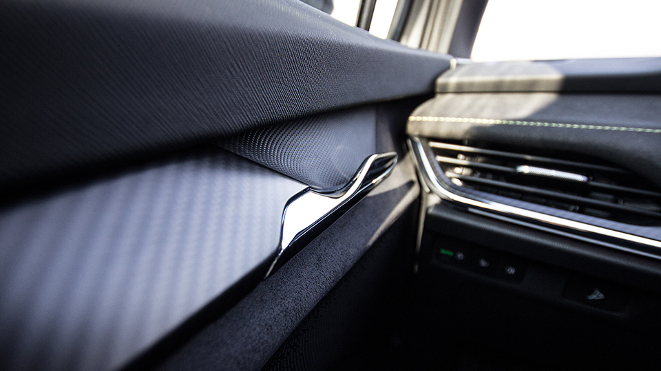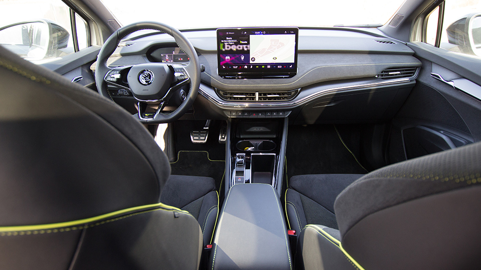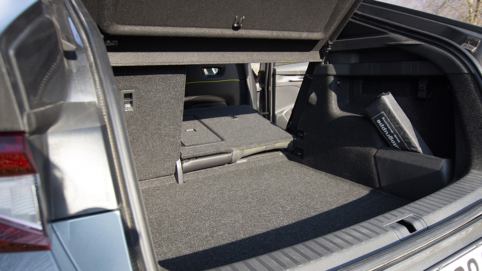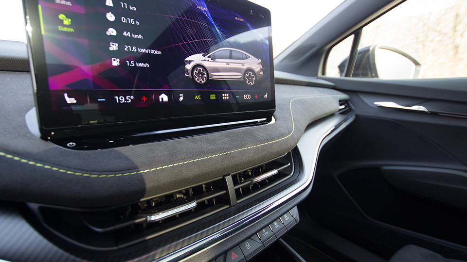 Sportliches Design bedeutet jedoch nicht, dass Abstriche im Innenraum gemacht werden mussten. Dieser ist großzügig und bietet trotz abfallender Dachlinie viel Kopf- und Kniefreiheit – auch wenn es Richtung 1,90 Meter Körpergröße geht. Von hinten sähe man auch sehr bequem auf das riesige 13 Zoll Display im Dashboard, welches das kleine Instrumentencockpit deutlich in den Schatten stellt. Bestens gelungen ist übrigens auch das eigenständige Design des Innenraums mit viele Kanten, Absetzungen und Materialwechseln. Optik und Haptik sind perfekt! Dabei wird zum Beispiel das Dashboard mit einem synthetischen Alcantara mit schönen Kontrastnähten veredelt. Da sind ID3 und ID4 ein paar Plätze weiter hinten anzusiedeln. Mit 570 Litern Ladevolumen fehlen zum Coupe nur 15 Liter, umgeklappt stehen um die 1.700 Liter zur Verfügung. In Sachen Assistenzsysteme bietet Skoda alles, was es im Mutterkonzern – samt den schönen Töchtern wie Audi oder Porsche – derzeit auch gibt.