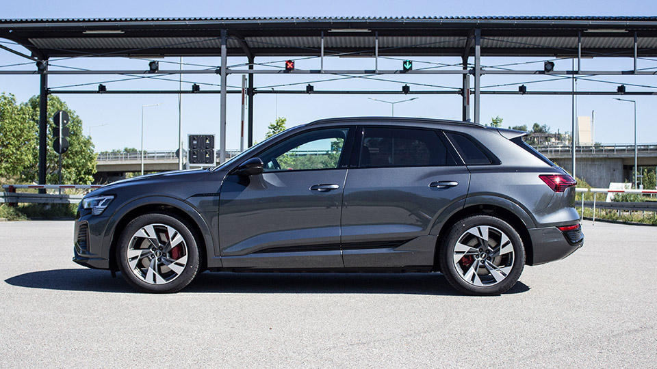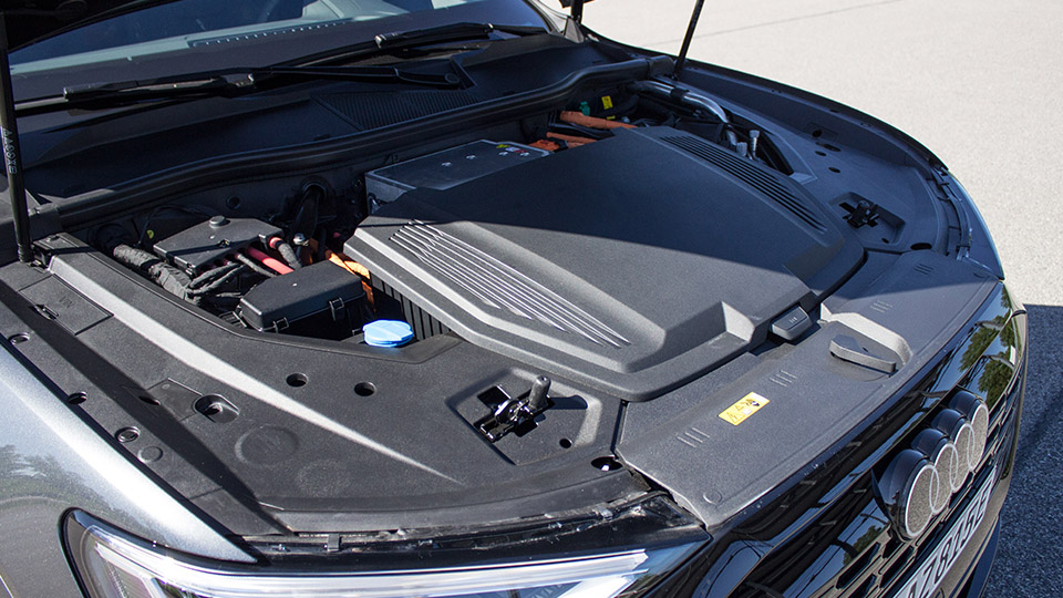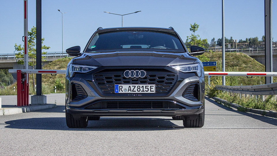 Unser 50 hat jedenfalls wirklich sportlich Power auf dem Pedal, die Landstraße macht Laune, das Luftfederfahrwerk ist Herr der Lage, auch wenn es holprig wird oder wir doch etwas flott durch die Kurven räubern. Die Q e-tron sind „Brocken“ und bringen ein Lebendgewicht von 2,6 bis 2,7 Tonnen mit. Dementsprechend werden auch massive Rad-Reifenkombinationen verbaut, denn Gewicht braucht Gummi, um genug Grip zu produzieren. Die Lenkung ist dabei präzise und die Überarbeitung der Vorderradaufhängung trägt absolut positiv zum Handling bei.
