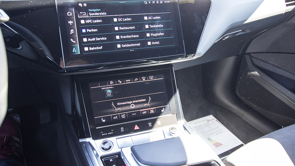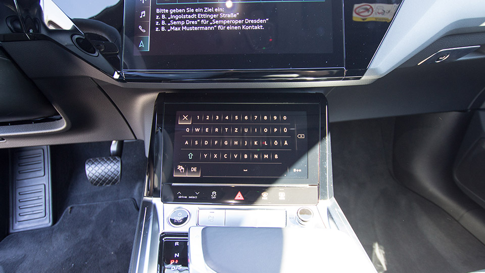 Startknopf gedrückt und nun die Automatik auf D stellen. Dazu hat Audi einen wirklich toll gelungenen Wahlhebel in die Mittelkonsole gebracht. Er ist fix verankert und dient gleichzeitig als Handauflage. Mit dem Finger wird ein seitlicher Hebel gezogen oder gedrückt und wechselt die Gänge. Die Hand da aufzulegen, hat aber noch einen weiteren Sinn: unter dem großen Mittelbildschirm (Map, Radio, Fahrzeugeinstellungen usw.) ist ein weiteres großes Display, auf dem unter anderem die Klimatisierung geregelt wird. Darauf erscheint im Stand zum Zieleintippen aber auch eine sehr große und bequeme Tastatur. Will man während der Fahrt ein Ziel eingeben, so malt man darauf die Buchstaben, da die Tastatur nun nicht mehr eingeblendet wird. Ob das den Blick weniger oft nach unten wandern lässt, bleibt offen, lieber nutzt man da dann doch die Sprachsteuerung, welche im Vergleich zu vielen anderen Anbietern wirklich sehr gut funktioniert. Das Interieur des Fahrgastraumes ist sehr hochwertig verarbeitet und es gibt Audi-typisch eine sehr große Anzahl an Material- und Ausstattungsoptionen. Die Optik der digitalen Instrumente ist wirklich gelungen und ergänzt die Designsprache des Innenraums – und das sagt der Analoginstrumentenliebhaber! Und trotzdem ist das gesamte Arrangement insgesamt eher understatement anstatt protzig zu wirken.