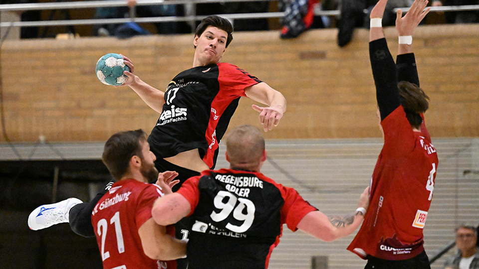 Mit einer klaren Antwort auf die Frage, was passiert, wenn sie nach dem abhanden gekommenen Günzburg-Spiel zuhause beim Auswärtsspiel bei der starken DJK Waldbüttelbrunn noch einmal verlieren, starteten die Adler am Samstag in die Abendpartie. „Wir sind gut reingekommen“, so das Ergebnis der Einzelbefragung verschiedener Spieler. Vor allem auch Flügelflitzer Tom Wuka, der nach zwei erfolgreichen Treffern beim einem Siebenmeter in der siebten Minute den gegnerischen Torhüter am Kopf streifte und dafür die Rote Karte erhielt. Das Siebenmetertor wurde aberkannt, Waldbüttelbrunn bekam den Ballbesitzen in Form eines Freiwurfes. Regensburg hatte mit einer offensiven 4:2-Abwehr die beiden WaBü-Werfer Linus Dürr und Leon Rastner etwas überrascht und ganz gut in den Griff bekommen. Beide Teams lieferten sind in der ersten Halbzeit eine relativ ausgeglichene Schlacht, die – mit leichten Vorteilen für Regensburg – in den 15:15-Pausentee mündete.