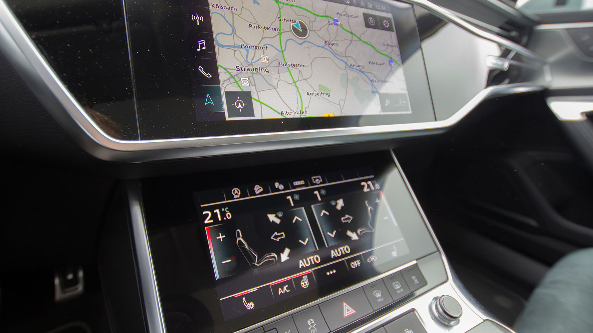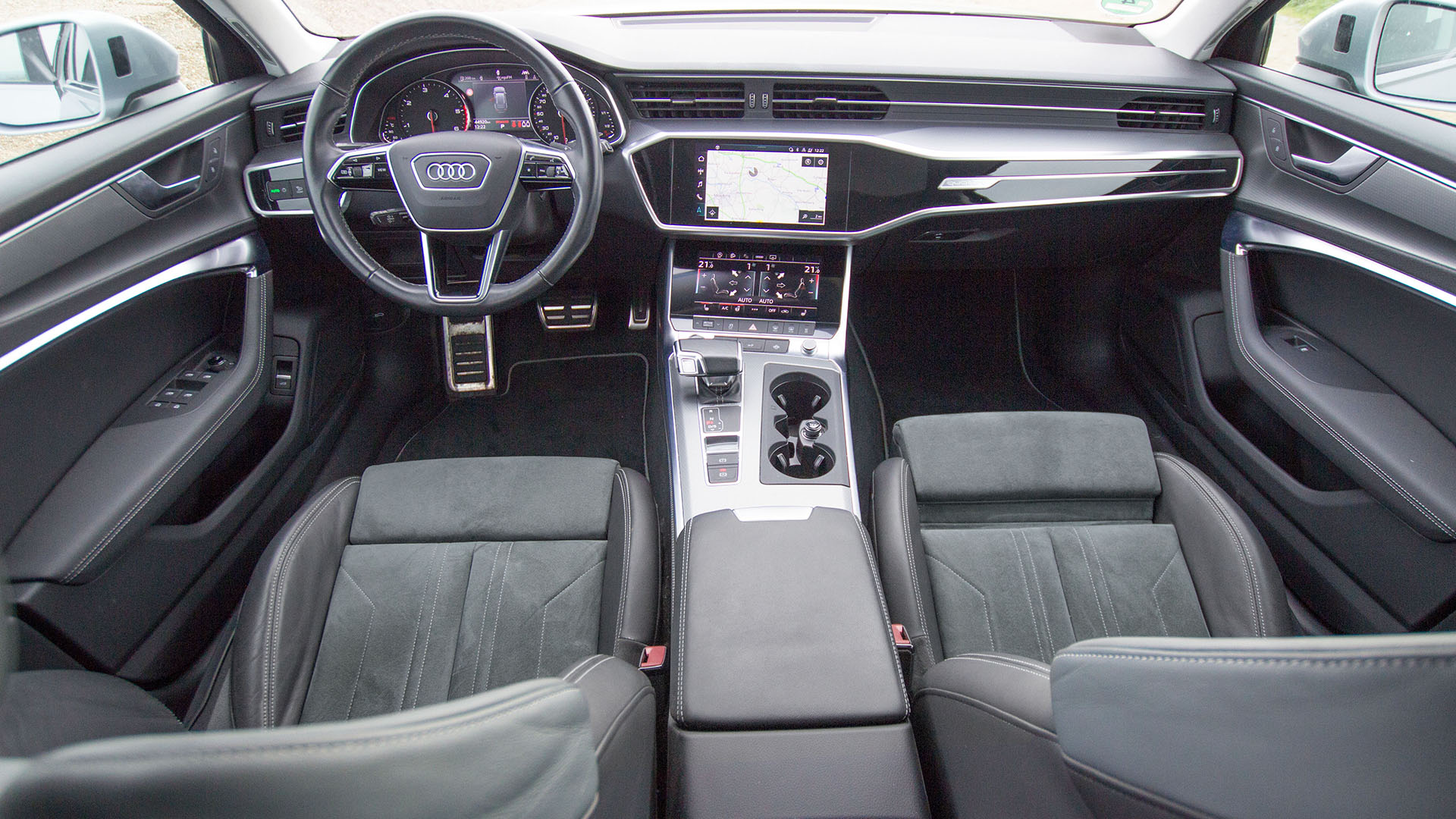 Innen ist der Audi A6 luxuriös: Leder kombiniert mit Alcantarasitzflächen (heißt hier Dinamica), schöne Ziernähte an allen Applikationen und viele Displays. In der Mittelkonsole steuert eines davon alles was mit Temperatur zu tun hat, vom Sitz bis zur Belüftung, anschaulich und einfach zu bedienen. Es ist schön, dieser wichtigen Funktionalität so viel Raum eingeräumt zu haben, gerade wenn es eben stark nach oben oder unten mit den Außentemperaturen geht und der Autoaufenthalt zum Genuss wird. Darüber ist das Infotainmentcenter zuständig für Navigation, Radio und Co. Die Instrumente unseres Testers sind analog – ein echter Zeiger - bald sicher bei allen weggespart und vielleicht allenfalls noch als teure Option zu kaufen.