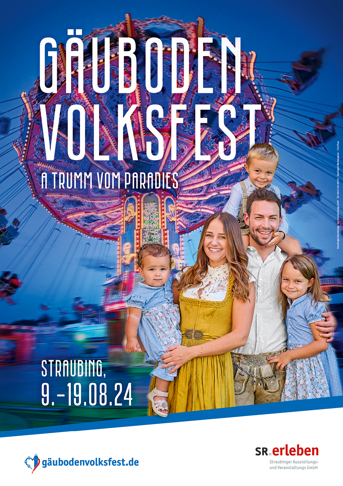 Das diesjährige Plakatmotiv zeigt eine junge Familie in Tracht vor dem Kettenkarussell in Straubing. Der Wellenflug ist unter den Fahrgeschäften ein beliebter und zeitloser Klassiker für Jung und Alt. Mit der wechselnden Beleuchtung ist er besonders in den Abendstunden ein beliebtes Fotomotiv. Die Inszenierung weckt Emotionen und Vor-freude auf das ganz besondere Lebensgefühl während unserer sogenannten „5. Jahreszeit“. Das Motiv ist in Zusammenarbeit mit der team Elgato Werbeagentur und Foto Popp entstanden. Die Veranstalterin legt auch in diesem Jahr besonders viel Wert auf die Familienfreundlichkeit. An den beliebten Kinder- und Familientagen locken halbe Fahrpreise und Sonderangebote für alle bis 19 Uhr. Die originalen Volksfesttaler bringen mit elf Stück zum Preis von 10,00 Euro wieder ein Plus von 10 %. Erhältlich sind die Taler bei Tourismus und Stadtmarketing der Stadt Straubing sowie beim Leserservice des Straubinger Tagblatts.