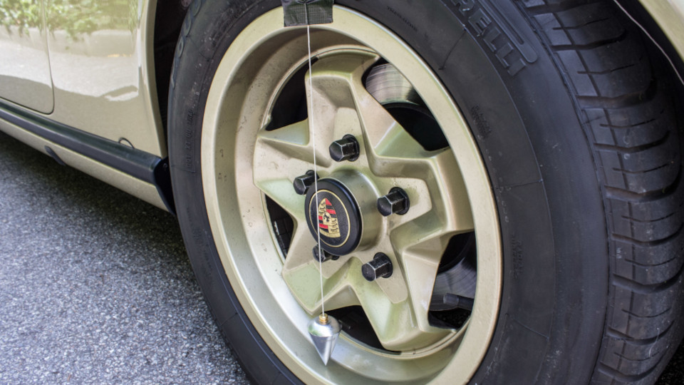 Es gibt zum Einstellen auch verschiedene Hilfsmittel wie u.a. Platten zum Drauffahren, Winkelmesser und Richt leisten. Wir haben über die Zeit ein paar davon getestet – aber bevorzugen tatsächlich Maßband, Senklot und Schnur. Der Profi macht es im Grunde nicht viel anders, jedoch mit modernen Lasern. Unsere eigenen Einstellungen sind normalerweise bis auf 0,1 Grad an den Sollwerten – mehr als ausreichend – und je mehr Oldie (und wenig Nutzung) desto einfacher die Entscheidung, denn mit Geschwindigkeiten jenseits der 300 km/h, fliegt man doch eher selten durch die Gegend. Wer etwas einstellen will, sollte den Reifendruck beachten, ein gleichmäßig abgefahrenes Profil haben und natürlich einen ebenen Untergrund. Hängt ihr Garagenboden schon auch nur ein Grad nach links um das Wasser abzuführen – dann wird (wenn nicht abgezogen) das Auto danach auf der Straße auch ein Grad „hängen“. Die Amerikaner hatten sogar verschiedenen Sturz links und rechts, weil die Straßen der 60er hängend gebaut waren um das Wasser abzuführen.
