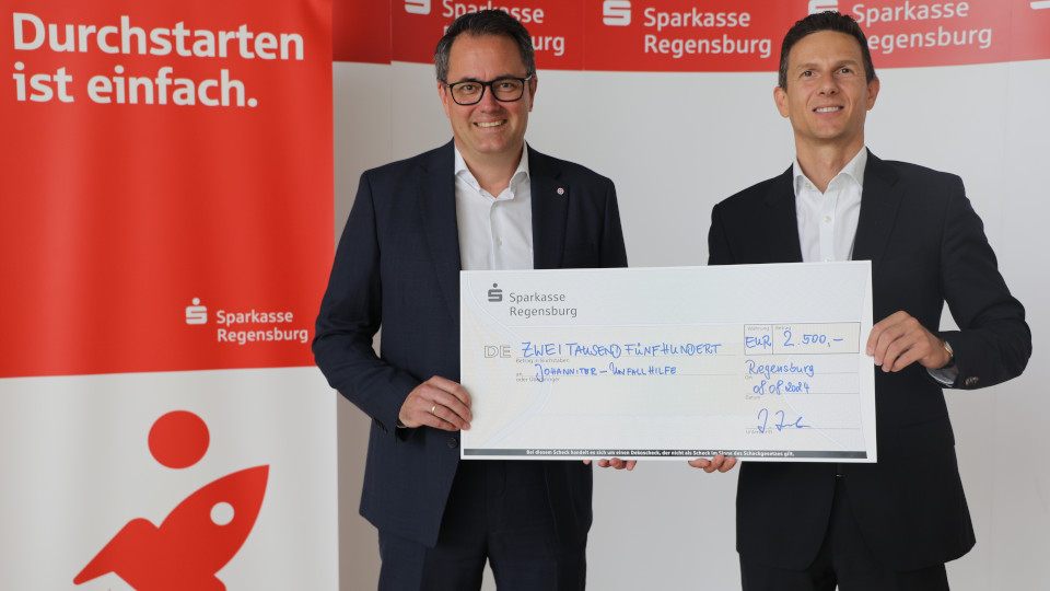 Bei der offiziellen Spendenübergabe überreichte Helmut Haneder, Leiter des Bereichs Vorstandsunterstützung der Sparkasse Regensburg, einen symbolischen Spendenscheck an Matthias Walk, Sachgebietsleitung Marketing, Kommunikation, Vertrieb und Fundraising der Johanniter in Ostbayern. „Unser Ziel ist es, dieses Jahr noch mehr Menschen zu motivieren, laufend Gutes zu tun und dadurch eine größere Spendensumme zu erreichen. Die Unterstützung der Sparkasse Regensburg hilft uns dabei sehr“, so Walk.