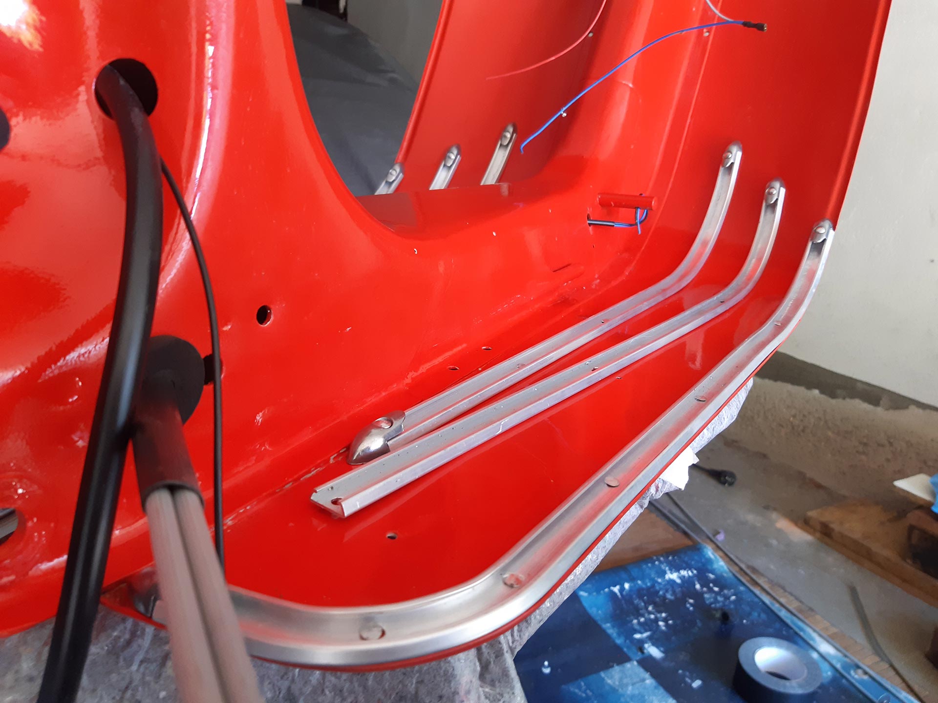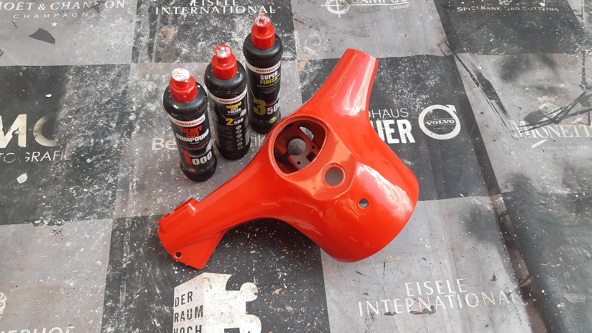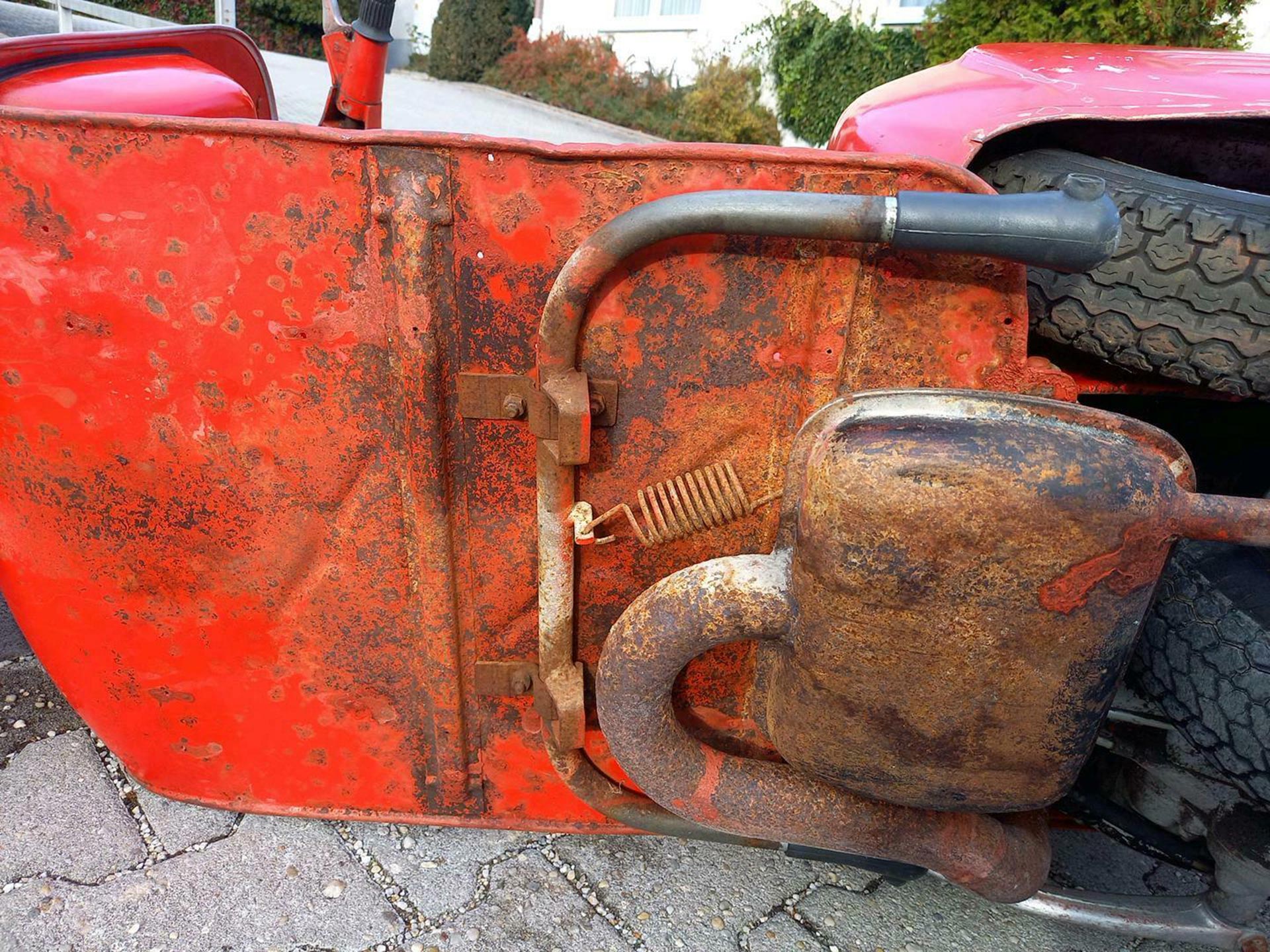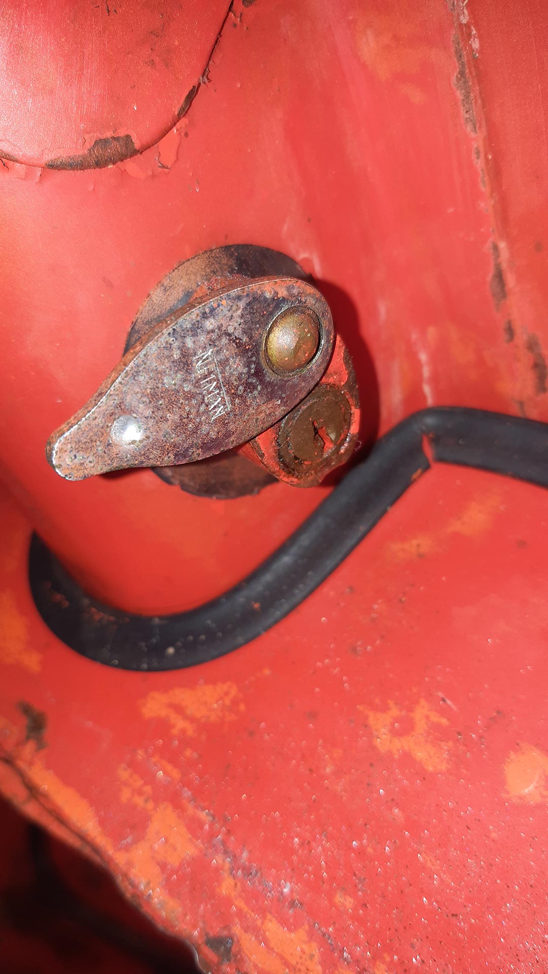 Und die Karosserie unserer Rally? Unsere Königin hatte nur oberflächlichen Rost und nicht mal an den Trittbrettern musste geschweißt werden. Wie sich erst später zeigte, ist das schönste aber, dass die Karosserie nirgends verbeult war oder Spachtel hatte. Das ist wirklich unfassbar selten, denn ein langes Leben zeigt sich bei den meisten doch als Kaltverformung an Beinschild, Kotflügel oder Seitendeckeln. Dass hier alle Teile original waren ließ sich einfach am Farbaufbau nachvollziehen: Blech, darauf die originale, graue Grundierung, darauf Rot (Rosso Corsa). Darüber gings dann wohl mal los: eine weiße Grundierung, dann oranger Lack und drüber nochmal wieder roter Lack. Prost! Es wurden wirklich einige lange Arbeitstage verschwendet um den O-Lack freizulegen, aber es war einfach auch an den Trittbrettern und anderen Teilen zu viel Fläche ohne Lack. Was sicher auch zu den zwei schlampigen Überlackierungen geführt hatte. Und so wurde dann doch bis zur ersten Grundierung runtergeschliffen (ist diese gut, belasse ich sie lieber und greife die Substanz nicht weiter an), grundiert und schließlich mit Rosso Corsa in der Originalfarbe lackiert. Besonders viel Wert gelegt wurde natürlich auf den Erhalt alter Teile. Egal ob es die Wechselstromschnarre war, die erst zerlegt und instandgesetzt wurde, oder das Schloss des Handschuhfaches, für den in vielen Stunden ein eigener Schlüssel angefertigt wurde, um es zu erhalten.