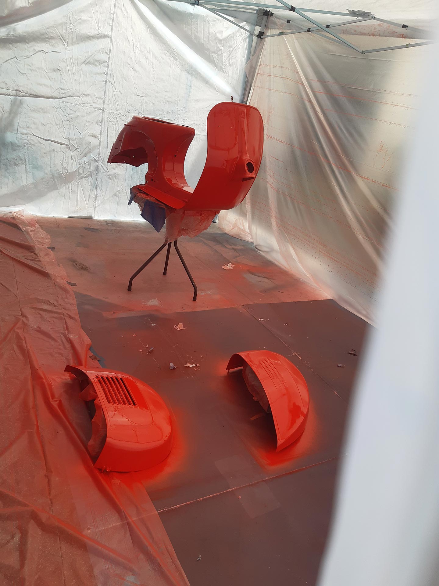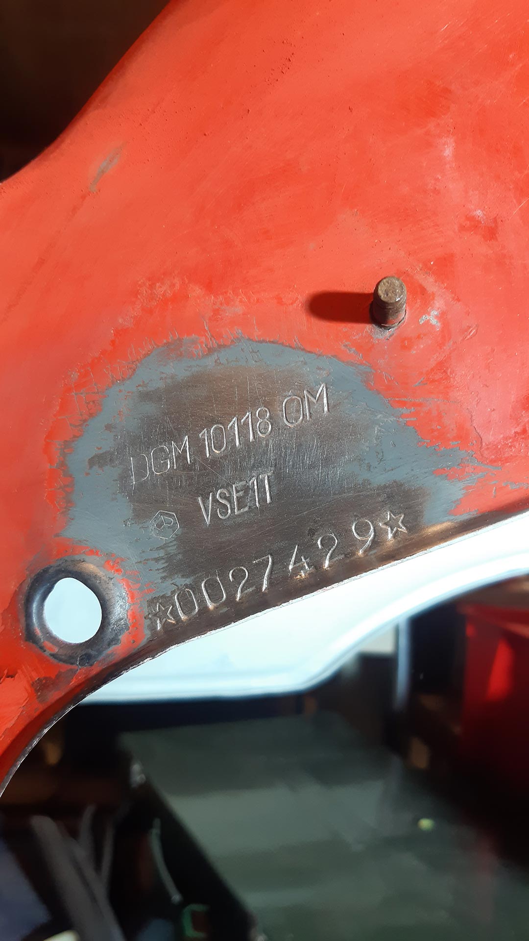 Hier wird man nie die gleiche Nummer am Rahmen und am Motor haben, aber im Werk wurde eben in Chargen rausproduziert und Rahmen und Motoren im gleichen Fortlauf aus den Regalen entnommen. Es hat sich herausgestellt, dass die Nummern um 150 abweichen. Bei uns z.B. um 116. Wichtig als Tipp natürlich: wie sehen die Flächen um die Nummern aus? Wenn hier nachgeschlagen wurde, muss die alte Nummer ausgeschliffen werden und damit auch das Material abgetragen werden. Am Rahmen wird es dünn, am Motor verliert es die ursprüngliche Guss-Struktur des Blocks. Gerne werden Vespen heute in der Resto an der Nummer nicht gelackt, um die Originalität einfacher aufzuzeigen. Wir haben an der Stelle Fotos vorab gemacht und später dann dort nur eine Schicht Grundierung und Lack aufgetragen – perfekt lesbar.