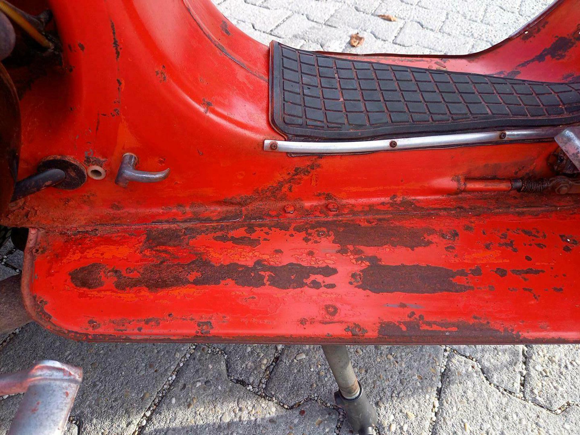 Tipp auch hier, wie schon in den ausführlichen Vespa-Restoberichten in früheren Ausgaben: werden neue Trittleisten oder der Kantenschutz angepasst, so wird dabei ZWANGSLÄUFIG Lack oder Grundierung verletzt. Gerade beim Kantenschutz bis er montierbar sitzt (Rally: verchromtes, geschlitztes, scharfkantiges Stahlrohr). Wer selbst grundiert ist im Vorteil: man hat dann schon ein quasi homogenes Lackbild und sieht genau wie Schutz und Leisten später Schatten werfen oder störend nicht passend anliegen. Wechseln sich beim Anpassen hier noch Rost und Farbe ab, erschwert dies die Beurteilung ob es sitzt. Ist das Anpassen durch, grundiert man eben einfach beschädigte Stellen nach. Wer nicht selbst grundiert, macht die Anpassungen vor dem Grundieren! Zum Nieten der Trittleisten empfehle ich Nietwerkzeug von SIP. Damit kann man schön in Ruhe alles alleine erledigen. Die Rückmontage der restlichen Komponenten ist dann gewohnt einfach und geht in wenigen Tagen vonstatten. Vespabauen erfordert keine Hilfe, sondern nur viel Zeit, gerade wenn es um Teileaufbereitungen geht. Trotz des guten Zustandes sind sicher 300 Stunden zusammengekommen. Auf geht‘s, egal ob mit einer schönen 50er oder einer Rally!