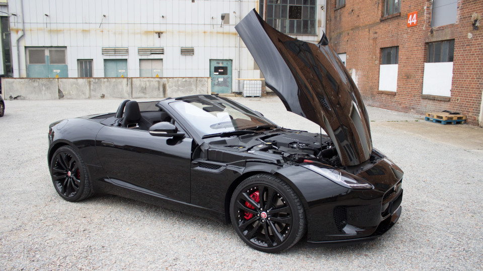 Es ist einer der letzten warmen Tage Mitte Oktober. Aber wie wir alle wissen, ist nach dem Sommer vor dem Sommer, und damit ist zumindest für uns Käufer ein guter Zeitpunkt, Cabrios bei den Händlern abzugreifen. Unseren Tester holen wir bei S&L in Pentling – zwischen Porsches und Ferraris steht die dunkle Katze zur Ausfahrt bereit und befreit sich in wenigen Sekunden vollautomatisch von ihrem Stoffdach. Dass sie das bis 50 km/h im Fahrbetrieb macht, erfreut den Städter. Schwarz/Schwarz mit ebenfalls dunklen 20-Zoll-Felgen: unser Cabrio kommt in der Black Pack Ausstattung. Schwarze Luftauslässe, schwarzer Überrollbügel, schwarzer Kühlergrill und auch das passend dunkle Interieur. Nur die Bremssättel leuchten rot hervor und versprechen sportlichen Spaß. Das lässt auch die Auspuffanlage vermuten: Startknopf gedrückt und ein satter, freier Klang flutet den Hof. Der F-Type zeigt sich übrigens auch bei späterem Warmstart immer kurz dem Publikum, denn die Klappe geht hier immer auf, der Motor arbeitet kurz auf sportlicher Drehzahl – hier bin ich! Let‘s go.
