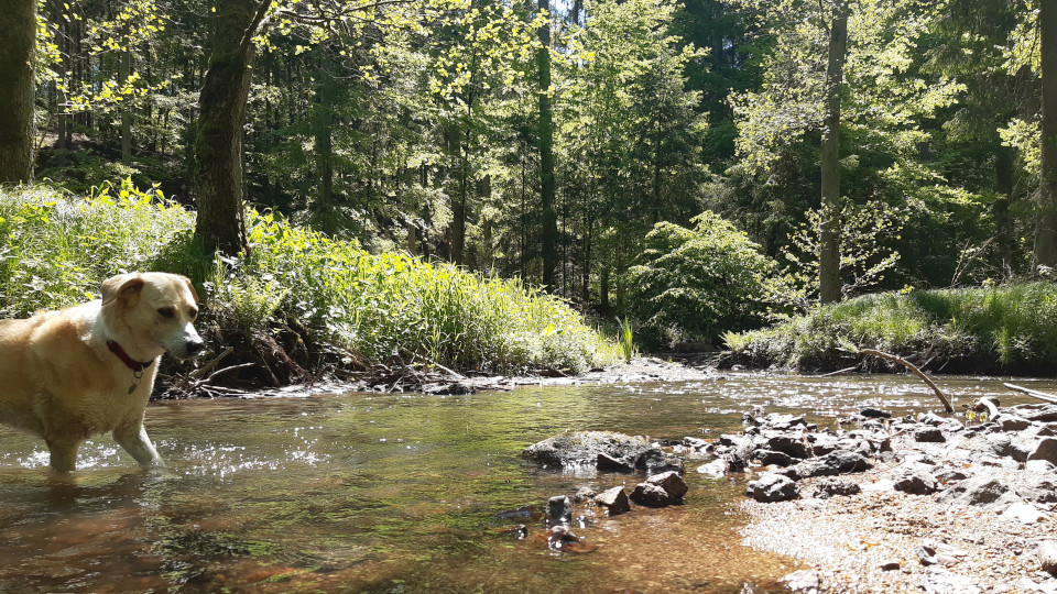 Auch kann man hier vom Gasthaus nördlich weiterlaufen und ebenfalls herrliche Momente am noch lange weiterführenden Bach erleben. Der Teufel hat hier überall Granitbrocken hingeworfen und sie mit grünem Moos bewuchert. Auf der linken Bachseite sind zudem immer wieder steile Granitwände, ein verzaubertes Tal mit vielen Möglichkeiten. Es bildet die Westgrenze des großen Forstmühler Forstes, in dem sich vieles entdecken lässt und der auch nach Jahren immer wieder neue Geheimnisse und unendlich viele Routenmöglichkeiten bis nach Bach und Wiesent offenbart.