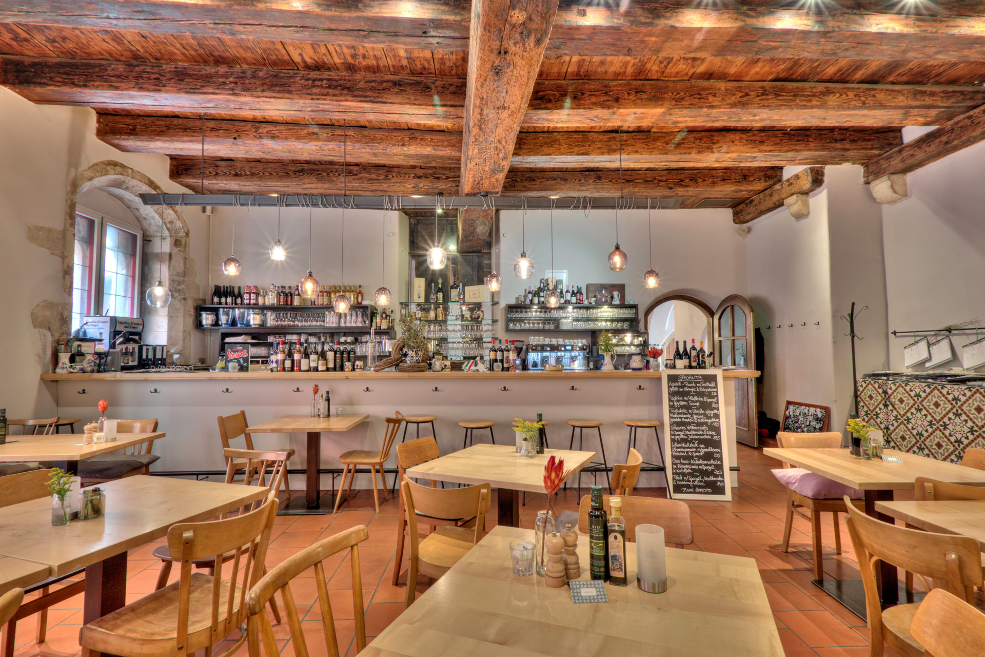 Mitten in der Altstadt zwischen den beiden malerischen Straßenzügen „Hinter der Grieb“ und „Vor der Grieb“ hat sich in der ehemaligen Stadtburg eines alten Adelsgeschlechts ein junges und modernes italienisches Restaurant etabliert. Der Innenhof wirkt wie im neapolitanischen Palazzo, die Räume kokettieren ohne Kitsch mit ihrem Alter.