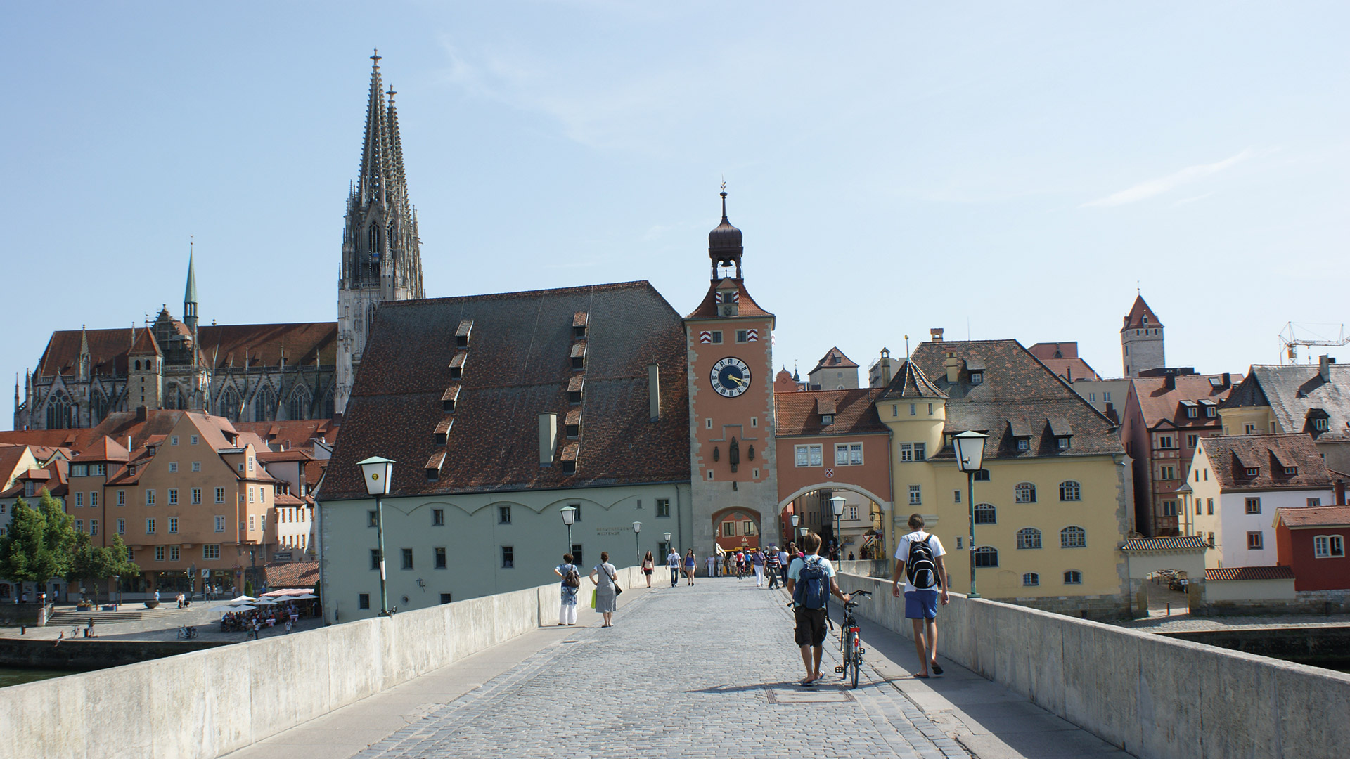 Die Steinerne Brücke wurde im 13. Jahrhundert mit drei Wehrtürmen ausgestattet. Der „Schwarze Turm“ nahe Stadtamhof wurde samt seinen Gräben, kleinen Wehrtürmen und seiner Zugbrücke aufgrund von Kriegsschäden 1810 beseitigt. Der Mittelturm wurde bereits 1784 nach einem Eisstoß zu instabil und musste abgetragen werden. Als einziger Turm steht heute noch der Brück- oder Schuldturm auf der Stadtseite, dessen Uhr und Bemalung nach den Schlachten des 30-jährigen Krieges neu gestaltet wurden.