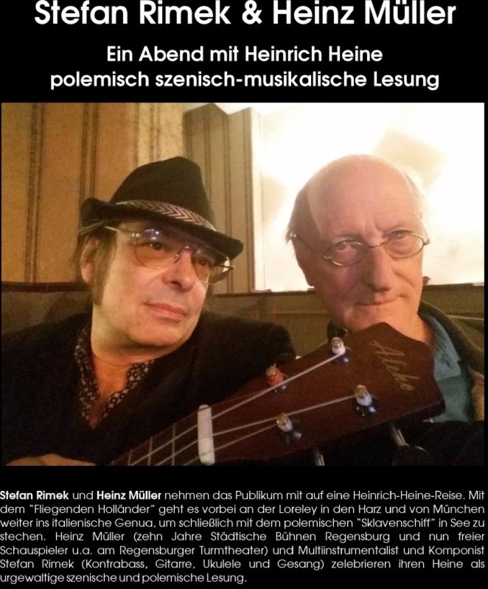 Heinz Müller und Stefan Rimek entführen das Publikum auf eine Reise mit Heinrich Heine, der als »letzter Dichter der Romantik« gilt und zugleich deren Überwinder war. Er erhob das Feuilleton und den Reisebericht zur Kunstform und verlieh der deutschen Literatur eine zuvor nicht gekannte elegante Leichtigkeit. Die Werke kaum eines anderen Dichters deutscher Sprache, wurden bis heute so häufig übersetzt und vertont. Die beiden Künstler präsentieren die vielen Facetten des Schriftstellers und engagierten Lyrikers Heinrich Heine solistisch, mit Musik und im Dialog.