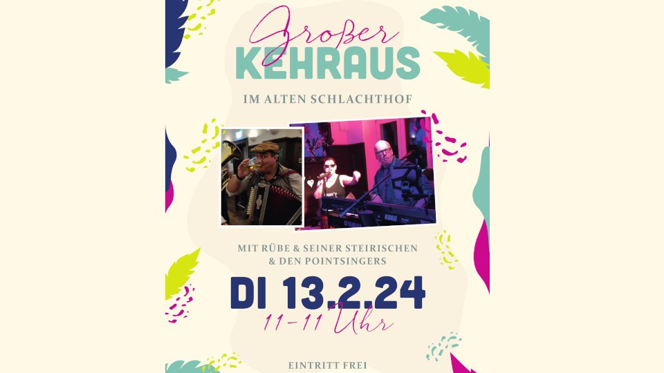 Der Faschingsdienstag wird zum Fest der Fröhlichkeit! Rübe & Seine Steirische und die Pointsingers sorgen beim Großen Kehraus im Alten Schlachthof in Regensburg für musikalischen Schwung. Bereits ab 11:00 Uhr geht’s rund – mit ausgelassener Stimmung bis in die Nacht hinein.